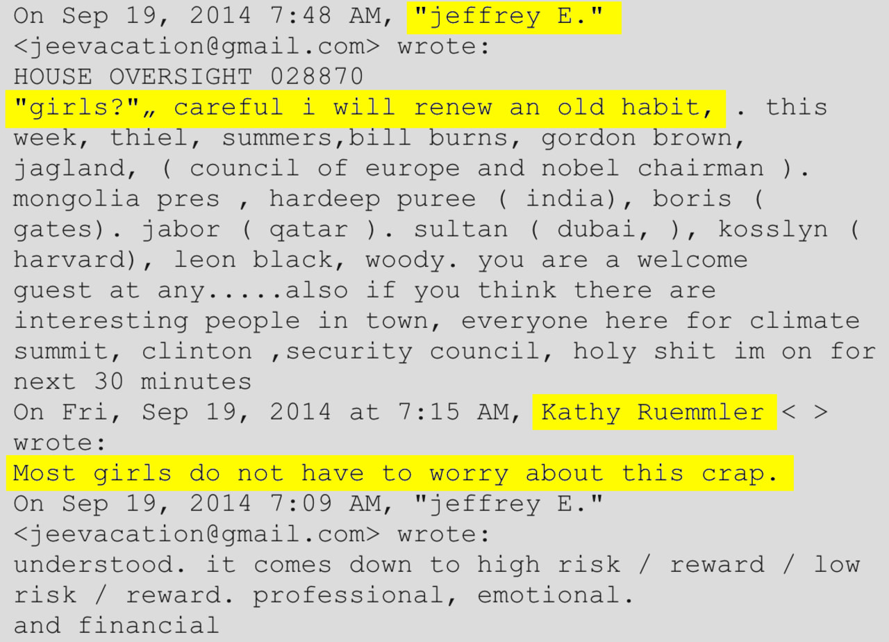 In response to Comment by Ruemmler in September 2014That ‘most girls don’t have to worry about this nonsense,’ regarding a conversation he was asking her to have with someone else,” Epstein wrote, “‘girls?’ careful, I will resume an old habit.