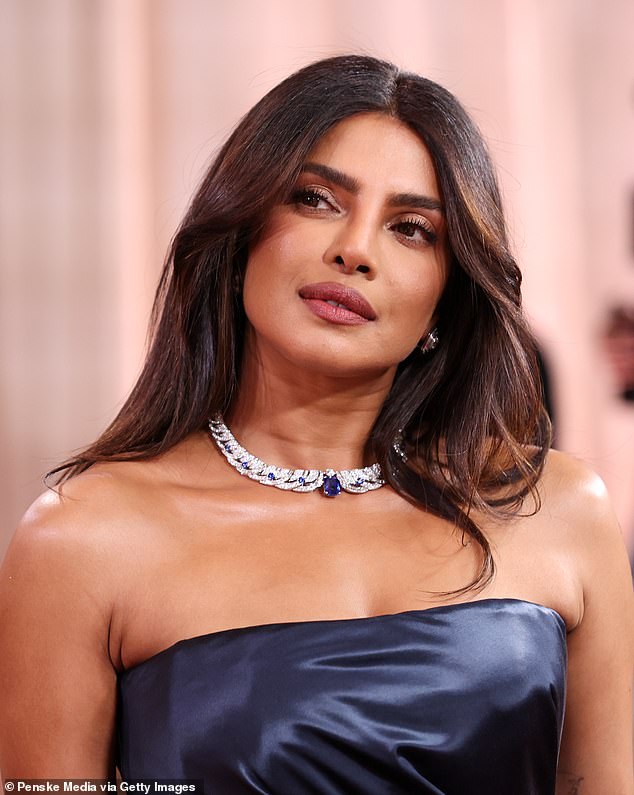 Chopra, 43, presented an elegant appearance in a long midnight blue dress that evoked the essence of classic Hollywood, featuring a double-layered skirt and a metallic top.